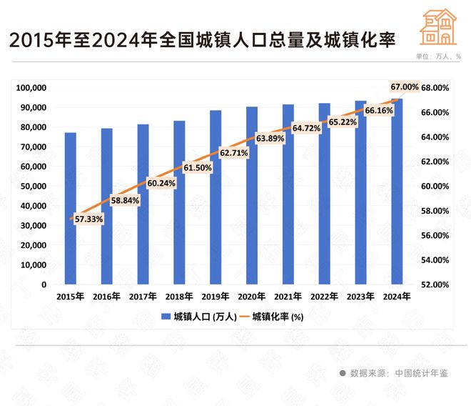 根据国务院报告,2019年至2024年,全国常住人口城镇化率从62.7%提高到67%。